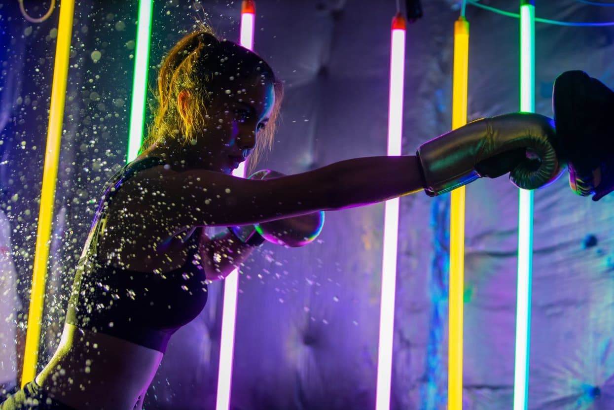 キックボクシングの基本の動作、パンチ、キックをリズムに合わせてアレンジした全身運動。 館内の照明を薄明かりにして、リングの上で、色鮮やかなスポットライトを浴びながら、トランスなどのダンスミュージックのリズムに合わせて身体を動かします。 気分爽快、この広い空間とリング上からの非日常な景観、ここでしか味わえない、エンターテイメントキックエクササイズ!!ぜひ体験してください。
